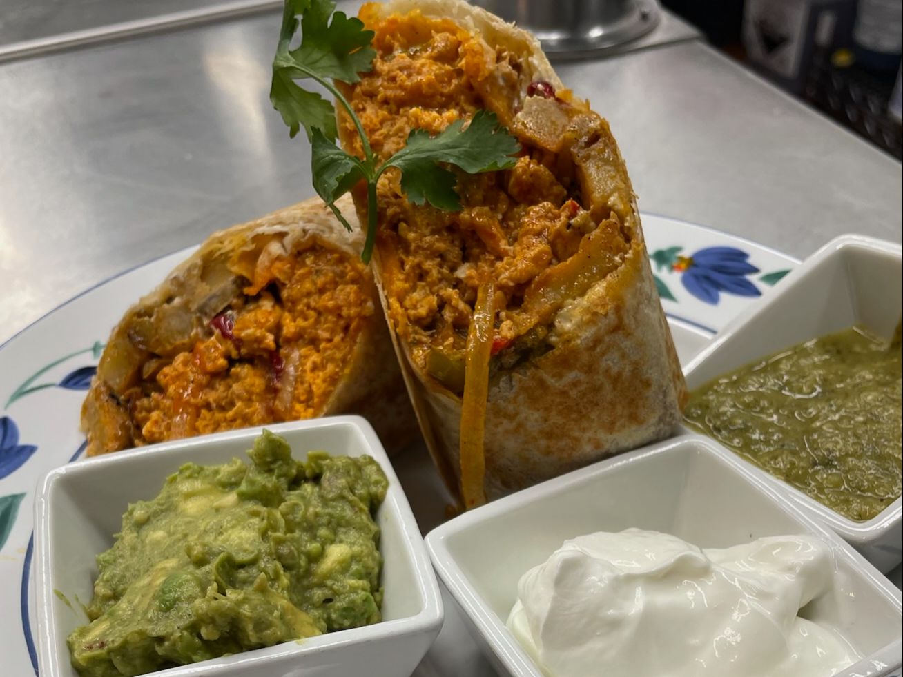 Try our NEW Breakfast Burrito! Tortilla wrapped around scrambled eggs, potatoes, bell peppers, onions, cheddar cheese, queso fresco, sour cream, our house salsa verde, and guac! Your choice of bacon, sausage, ham, or chorizo!